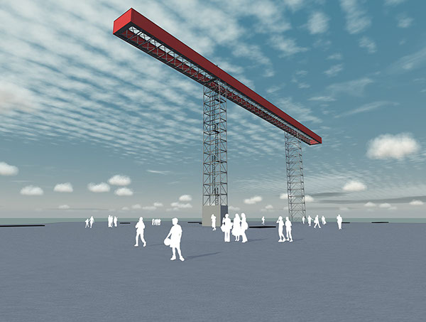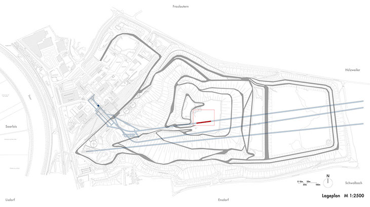 Die Landmarke ist das sichtbare Zeichen des nach langer Zeit zu Ende gehenden Bergbaus, sie ist Symbol für diese Tradition. Der Leuchtbalken ist Bestandteil der urbanen Landschaft und bildet einen weithin sichtbaren Identi kationspunkt. Die Bergbaulandschaft bleibt von der Landmarke unberührt. Wegeführung und Haldenniveau werden nicht verändert.