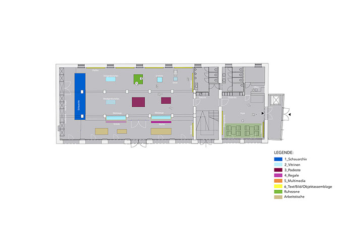 Dies gelingt durch eine großzügig offene Raumgestaltung. Verschiedene Raumfunktionen fließen im Ausstellungsbereich ineinander, und sichern den Kommunikationsfluss der einzelnen Bereiche. Der loft-artige Grundcharakter wird im Innenraums verstärkt. Das Depot grenzt sich von der Ausstellung gestalterisch ab. Der Ausstellungsraum, die Erschließung und das Foyer sind baulich in Abfolge klar getrennt. Die Kubatur des Gebäudes bleibt somit erhalten.